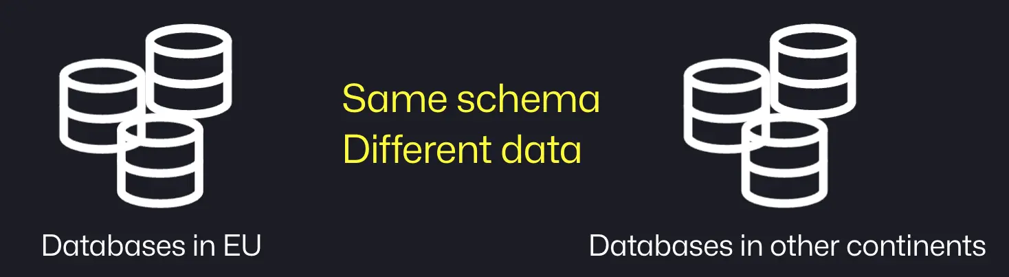 Each set of databases are in different regions/continents. They bear the same database schema whereas store different data. The databases in EU store the personal data from EU.